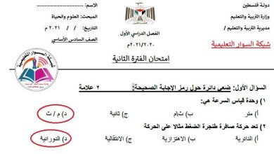 امتحان نهاية الفترة الثانية في العلوم للصف السادس- الفصل الاول